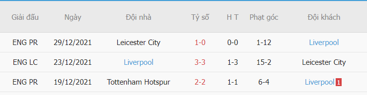 - Thống kê phạt góc sau 3 trận gần đây cho thấy Liverpool có cho mình được 31 pha phạt góc, còn về phía Leicester họ cũng có cho mình được 17 pha phạt góc.
