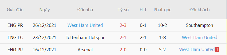- Còn về phía West Ham họ thất sự đang cho thấy một phong độ đáng báo động khi 5 trận thi đấu gần đây họ không có bất kì chiến thắng nào mà thay vào đó là chỉ có duy nhất 1 trận hòa còn lại là 4 trận thua.